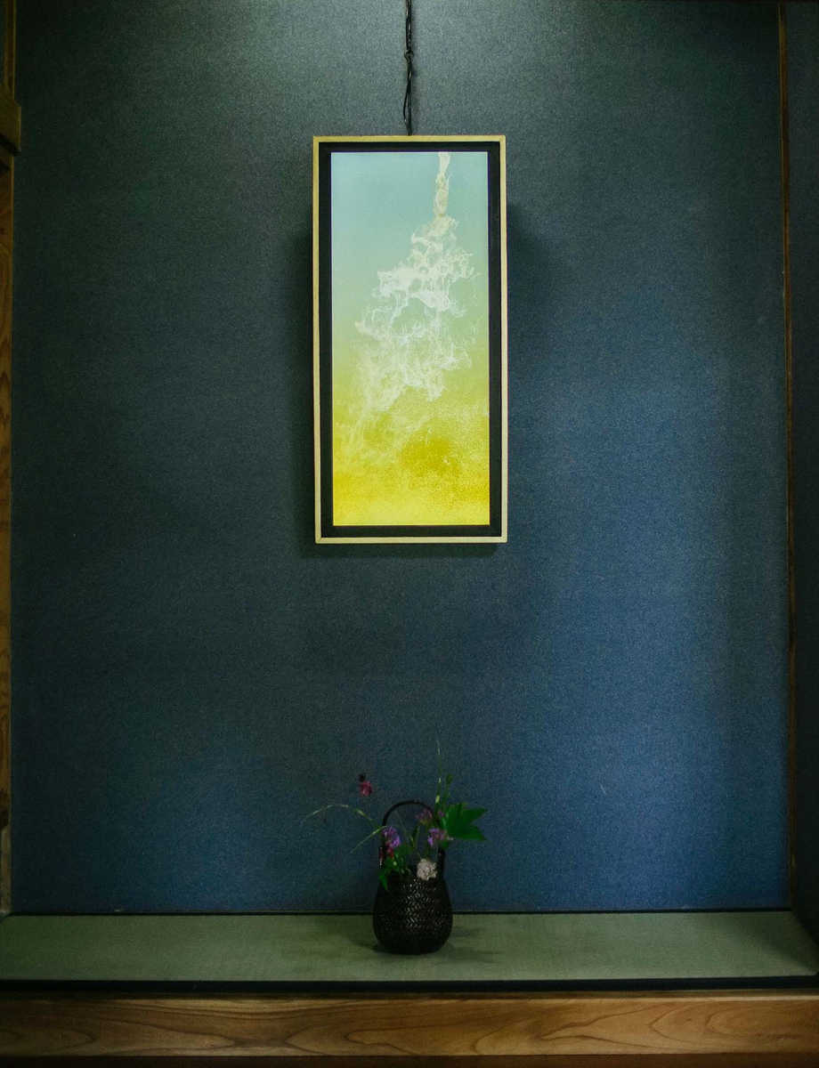 デジタル掛け軸に流れる映像は日本の太古からの自然が残る土地の自然音をもとに、コンピュータシミュレーションによる抽象化した自然現象を表現しています、映像はカートリッジ式になっており、その日の気持ちに合わせて映像を入れ替えられるように設計されています。